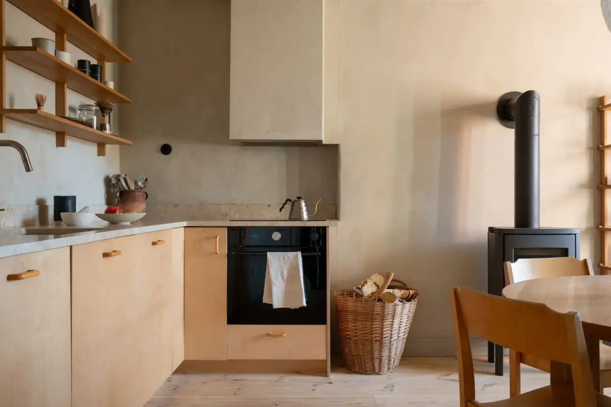 The newly renovated kitchen space pairs natural materials with gray plaster walls. The simple wooden cabinets are paired with a limestone countertop and wooden shelves.